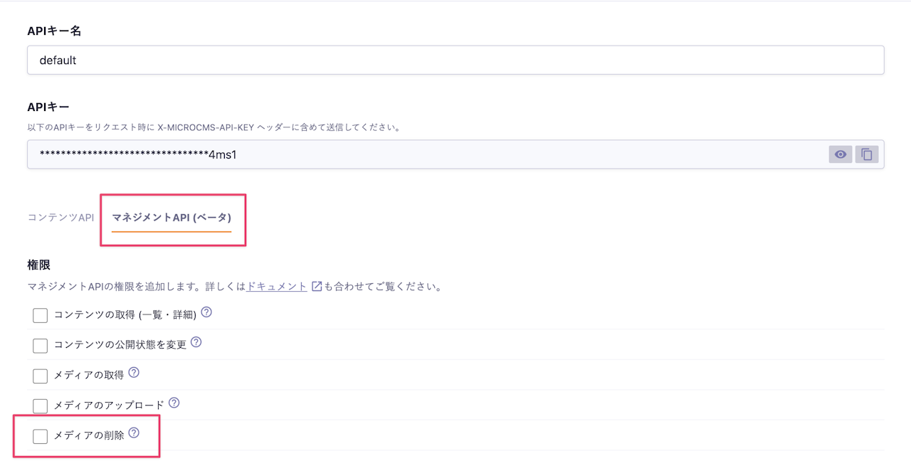 メディアの削除をAPIから利用するためには、APIキーに新たに権限を付与する必要があります。