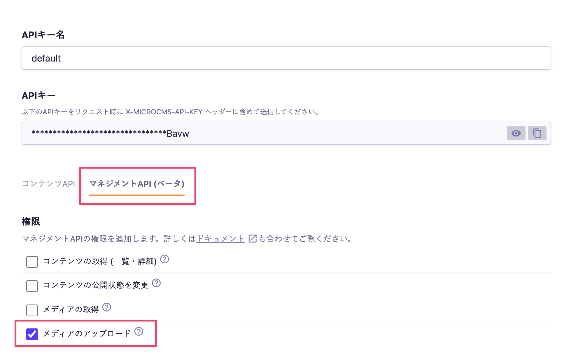 管理画面のAPIキー設定より、「メディアのアップロード」の権限を追加します。