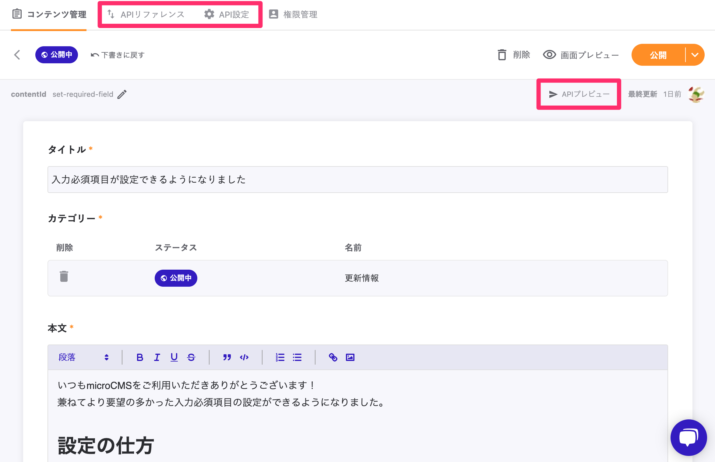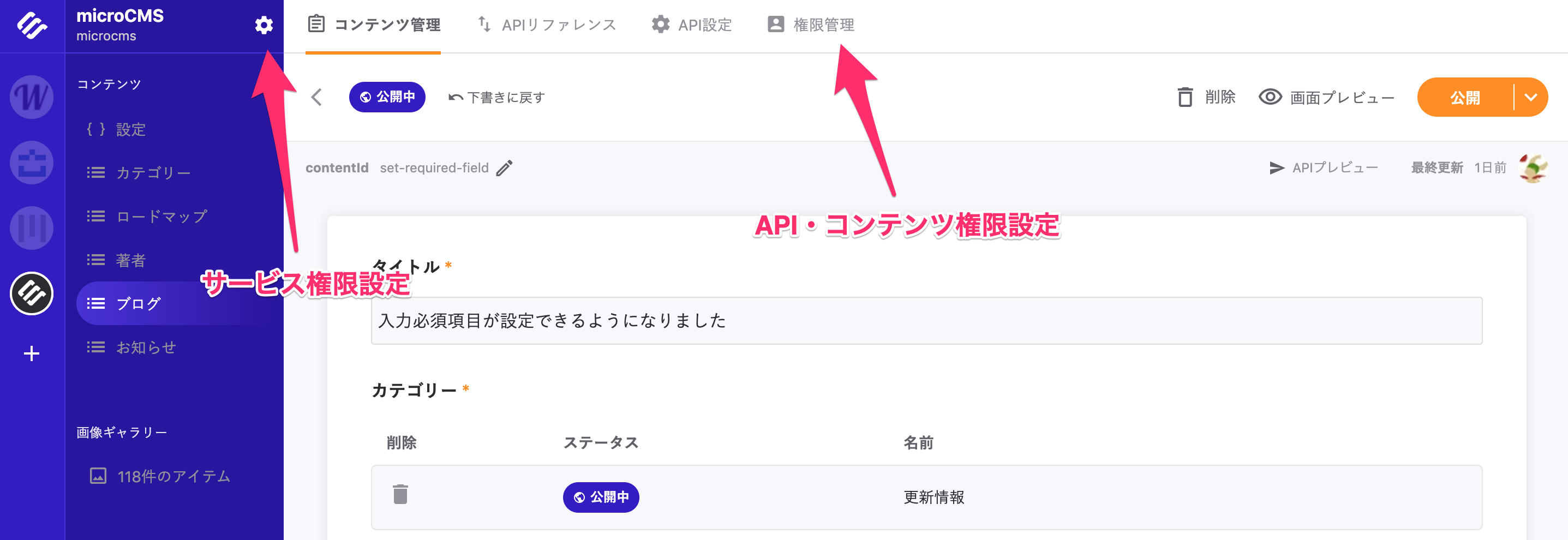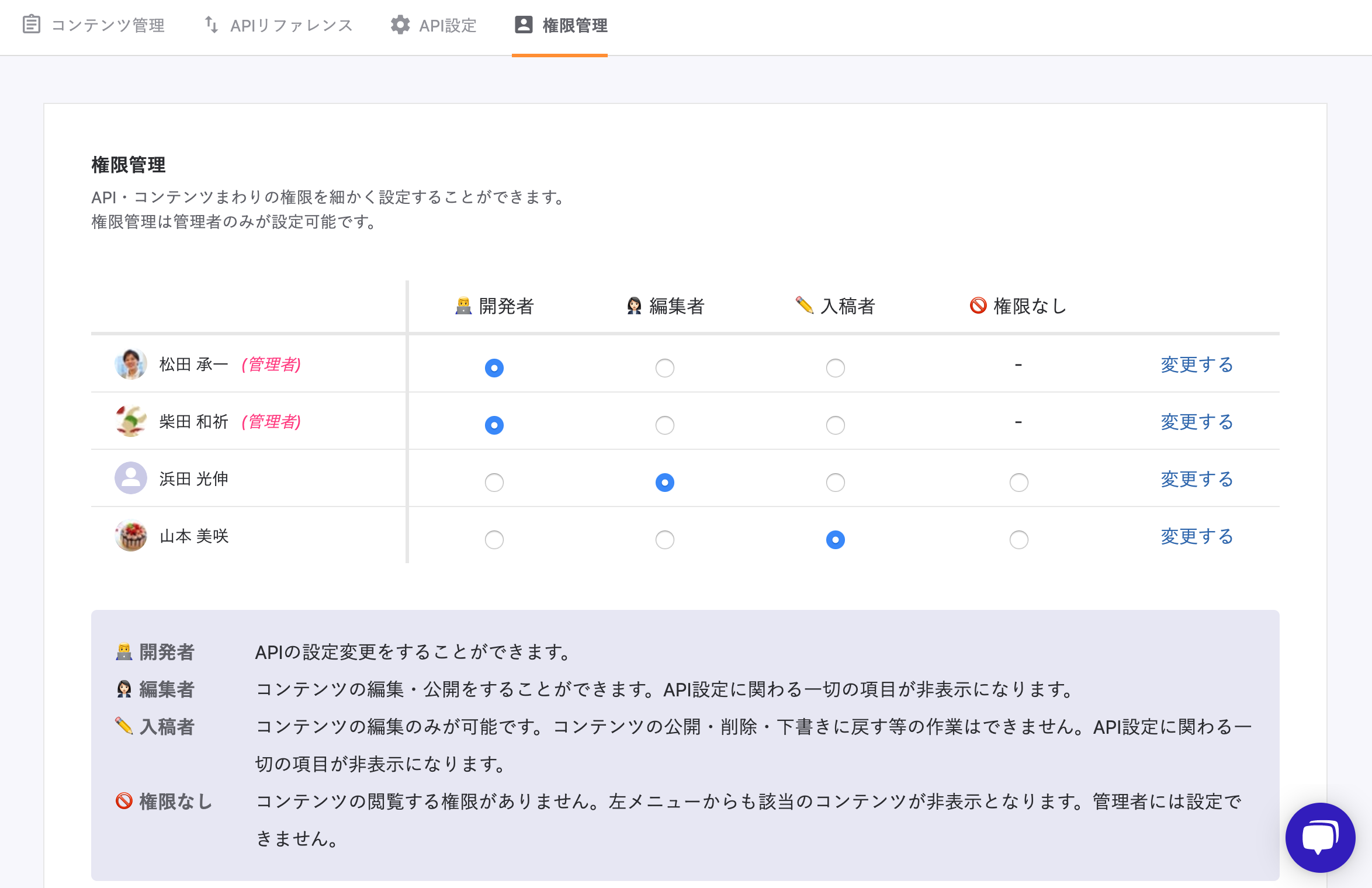 今回新たにAPI・コンテンツに対する権限として、「開発者」「編集者」「入稿者」「権限なし」という4つの権限を設定しました。