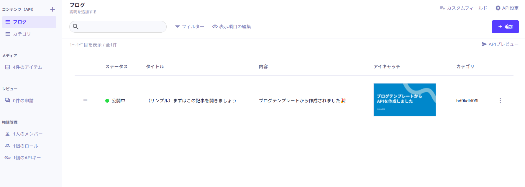 また、サンプルコンテンツが1件追加されているので、すぐにAPIをコールしてレスポンスを確認することができます。