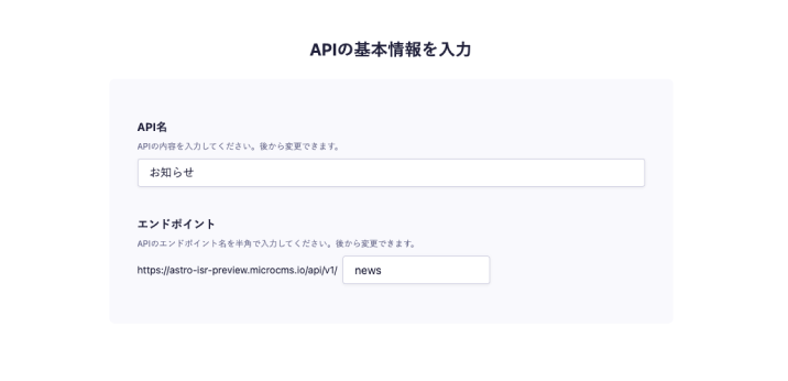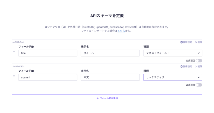 まずはコンテンツを管理するためにmicroCMSでお知らせ(news)というAPIを用意します。