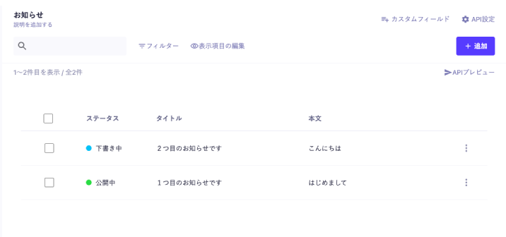 APIが用意できたら、後ほど動作確認をするために「公開中の記事」と「下書き中の記事」を作成しておきましょう。