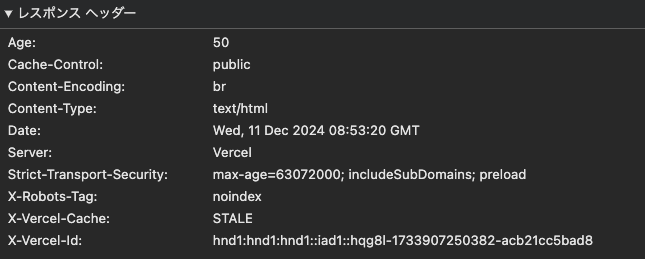 この時、レスポンスヘッダーに含まれるx-vercel-cacheの値からキャッシュの状態によってレスポンスがどのように処理されたかを確認してみましょう。レスポンスヘッダーはブラウザの開発者ツールなどで確認することができます。