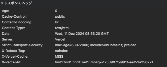 x-vercel-cacheはMISSを返しています。これはリクエストされたリソースがキャッシュに存在せず、サーバーから直接取得されたことを示します。取得されたデータはキャッシュとして保存されます。