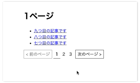 ブラウザでは、トップページ(http://localhost:4321/) にページネーションの1ページ目が表示され、ページ遷移ボタンの「前のページ」と「次のページ」とページ番号「1」からもトップページに遷移できることが確認できます。