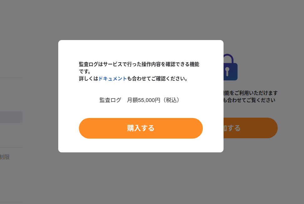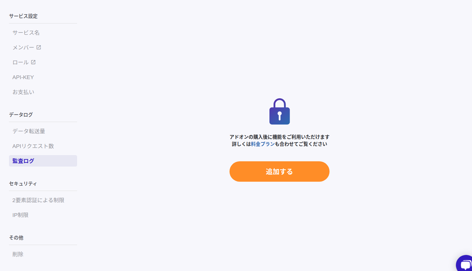APIのIP制限の場合、API設定 -> IP制限から追加することができます。追加するをクリックすると購入のモーダルが出てきます。