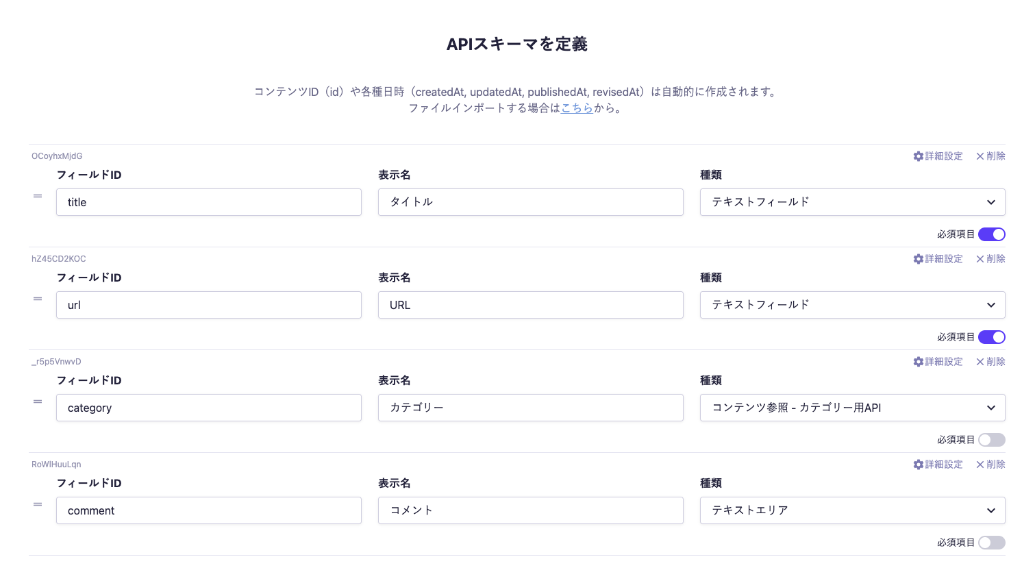 APIスキーマを定義できたら、使用したいカテゴリーをコンテンツとして追加しておきます。
