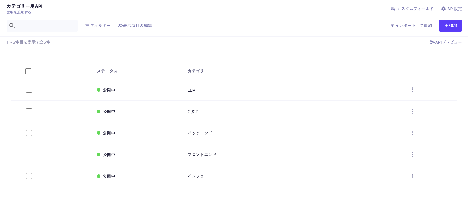 - 種類:コンテンツ参照(カテゴリー用APIを参照)
