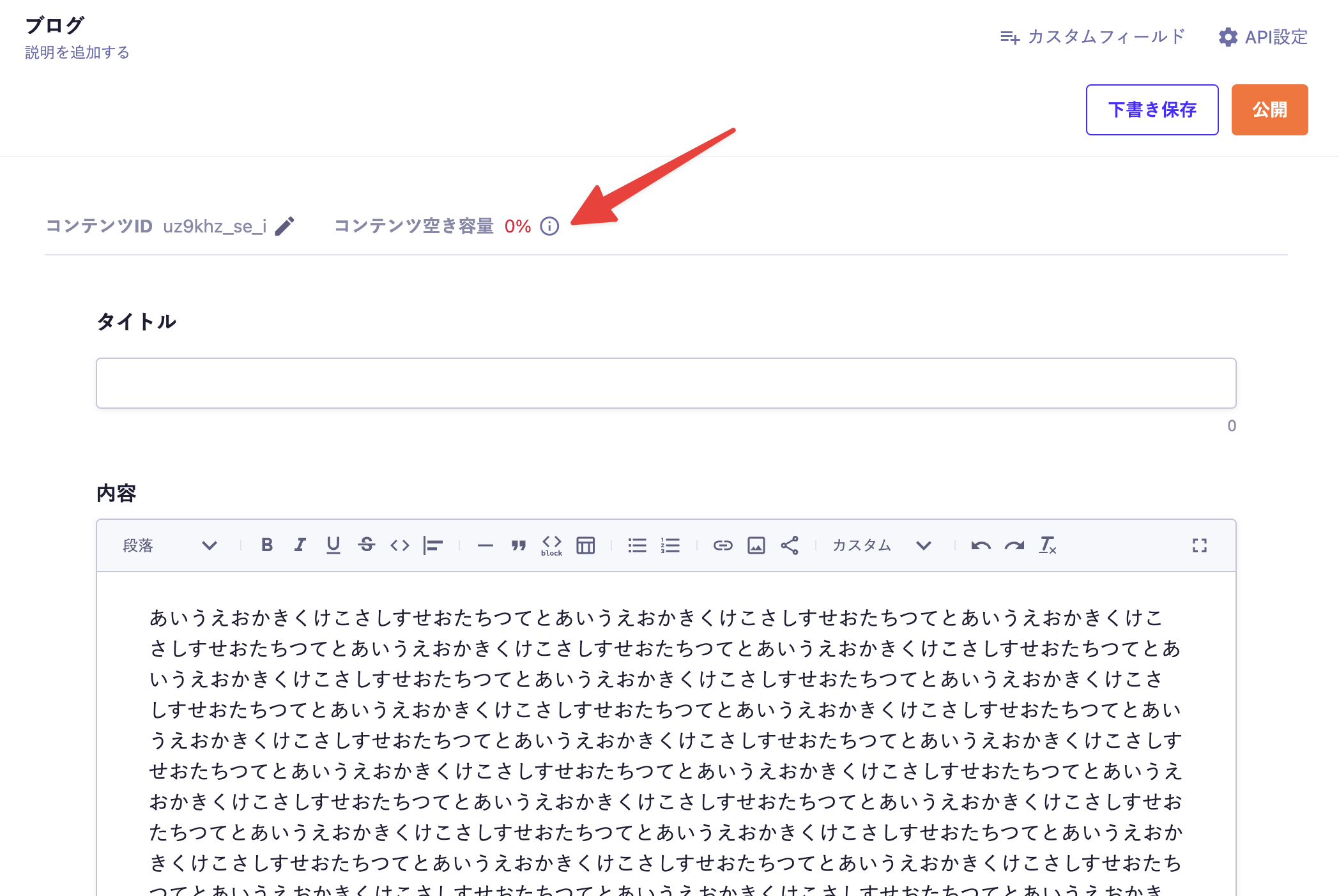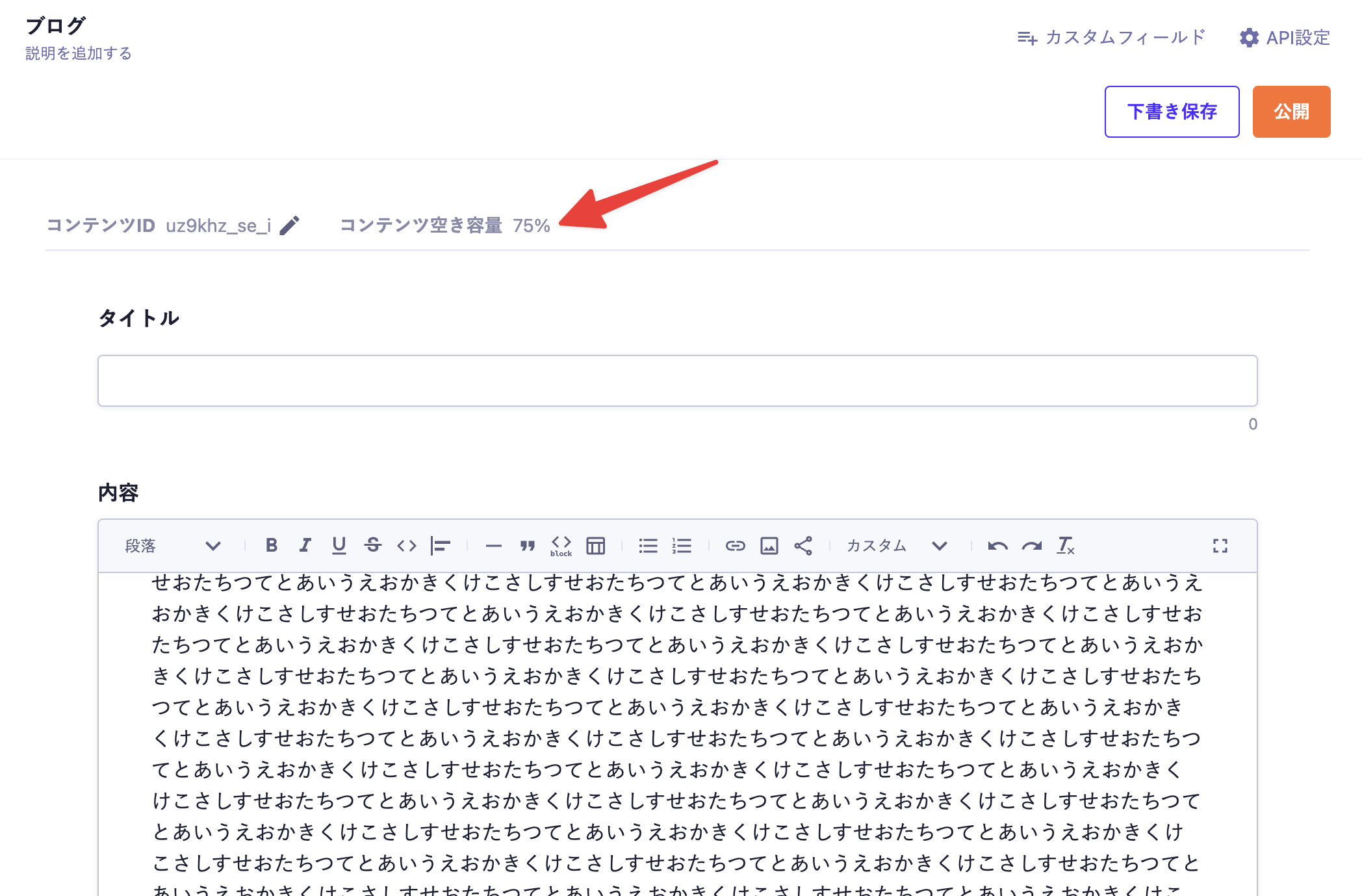 今回のアップデートで、コンテンツ作成・更新時の段階で入力中のデータに対してどのくらいの空き容量があるのか表示されるようになりました。