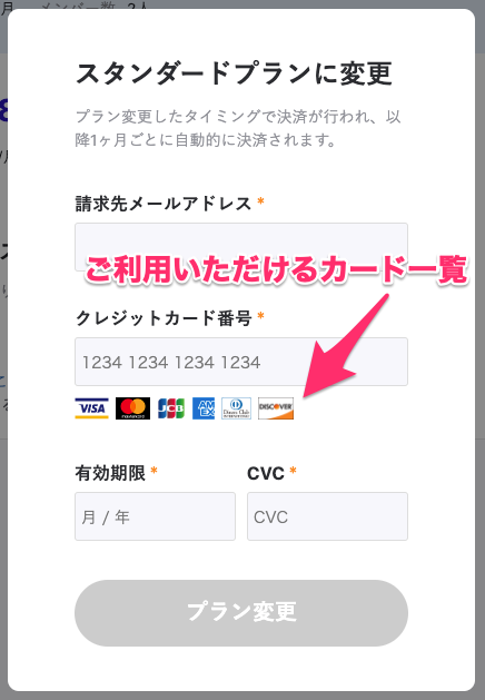 プラン変更画面で使えるカード一覧が表示されていますのでこちらもご参考ください!