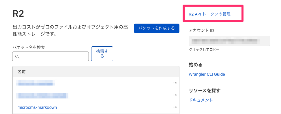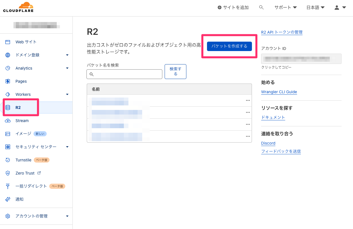 CloudflareのダッシュボードからR2のバケットを新規に作成します。