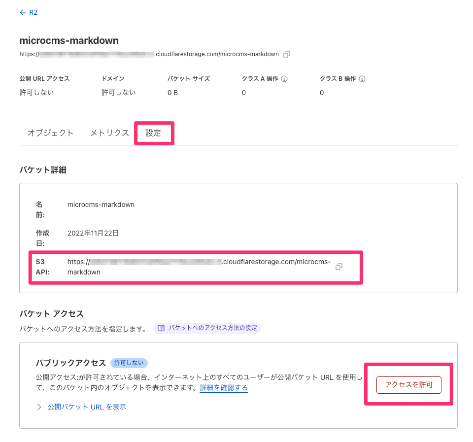 バケットは外部から閲覧可能な状態にする必要があるのでパブリックアクセスを許可し公開バケットURLを取得する必要があります。またNext.jsからAWS-SDKを利用してR2バケットへファイルをアップロードするためS3 APIもメモしておいてください。