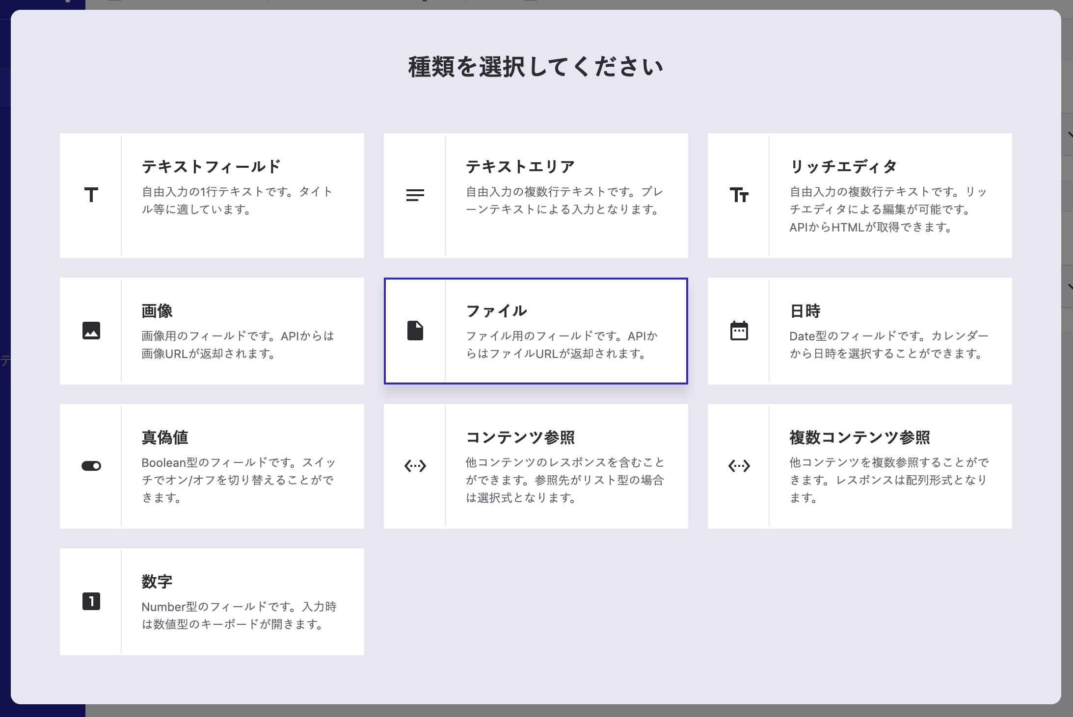 ファイルのアップロードに合わせて、フィールドの種類に「ファイル」を追加しました。