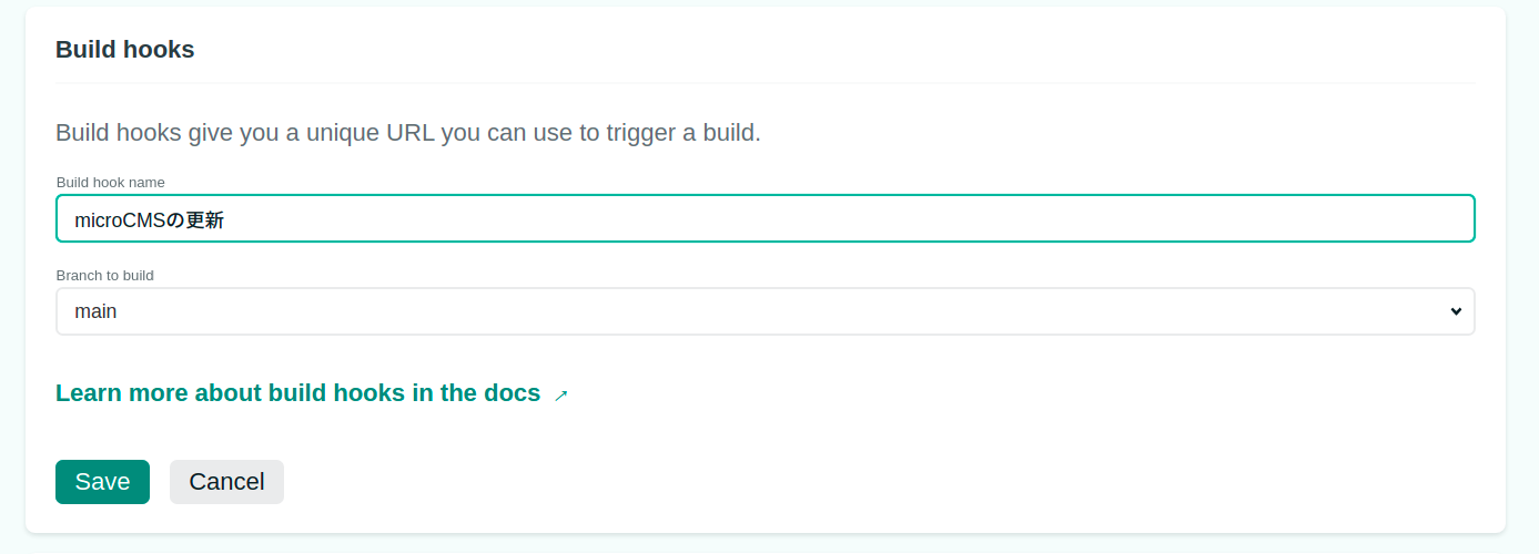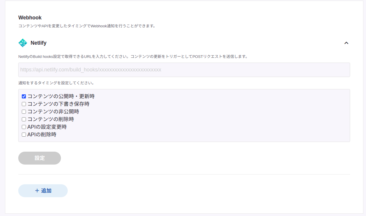 するとWebHookのURLが発行されるので、API設定 > Webhhokで先程のURLを設定すると、記事の更新時にNetlify側で再ビルドすることができます。