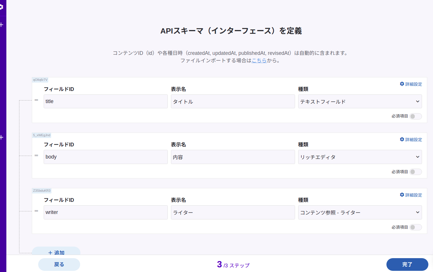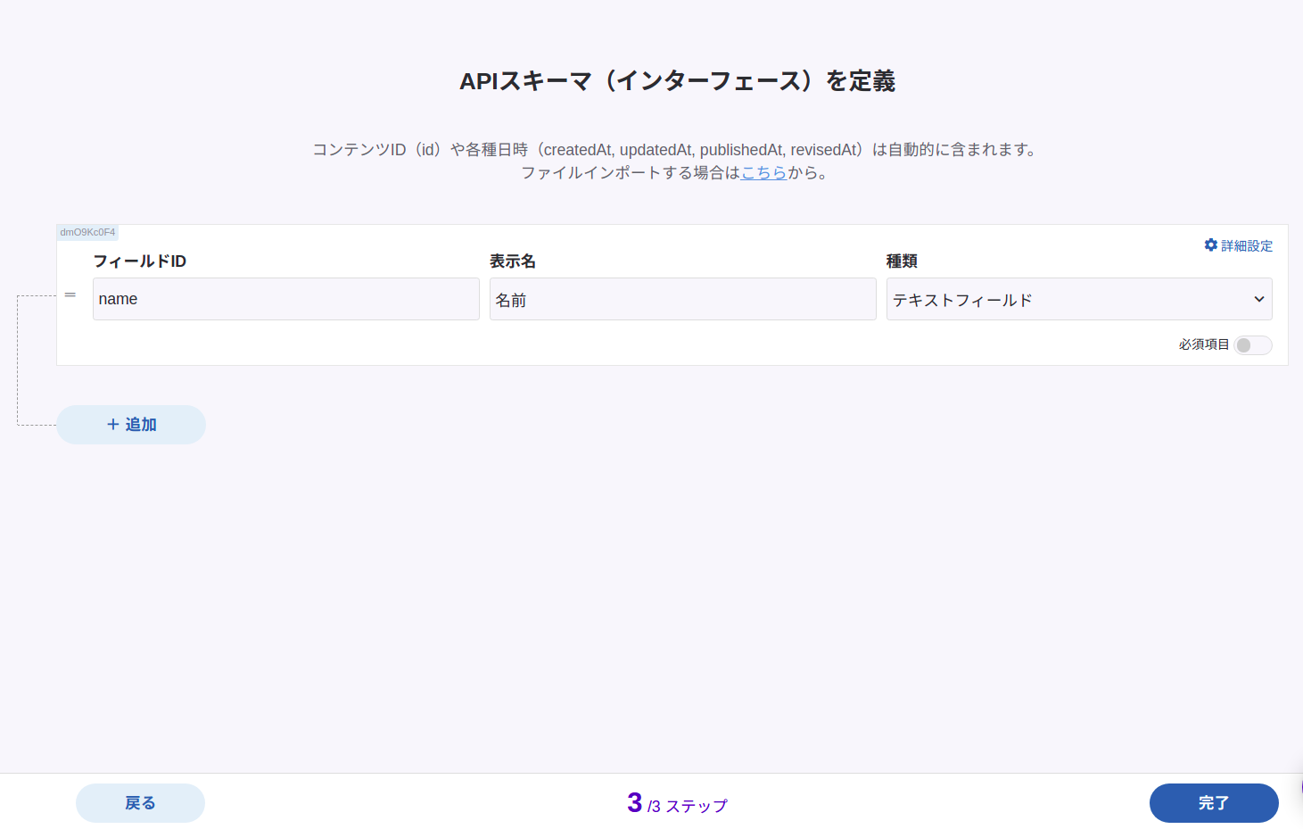 APIスキーマを作成します。内容は以下の通りです。入力が終わったら完了をクリックします。
