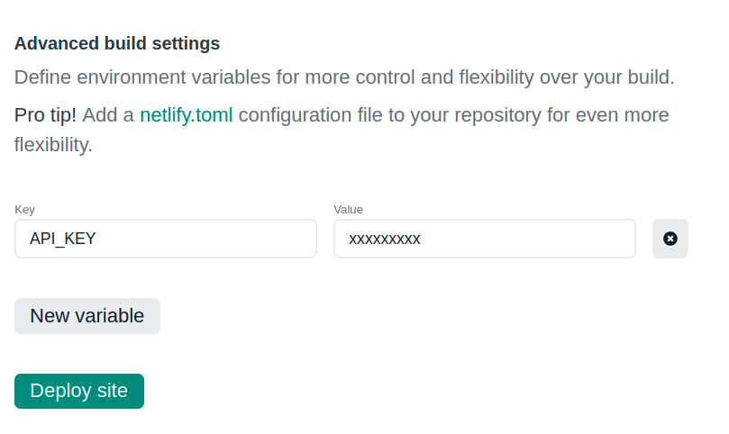Advanced build settingsから環境変数を設定します。これで、Deploy siteをクリックしてください。ビルドが始まります。