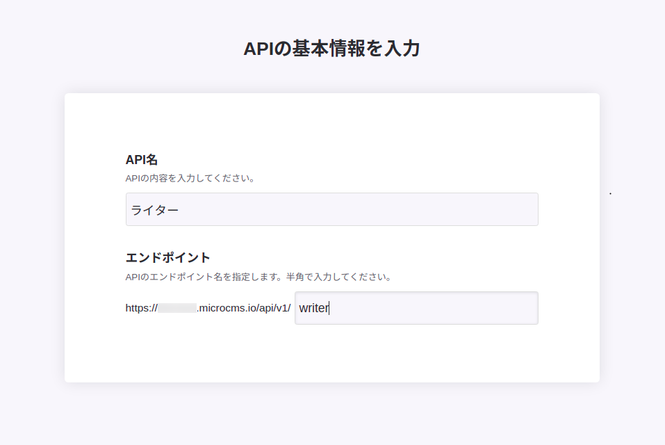 それでは、ライター用のAPIを作成していきます。API名にライター、エンドポイントにwriterを入力してください。