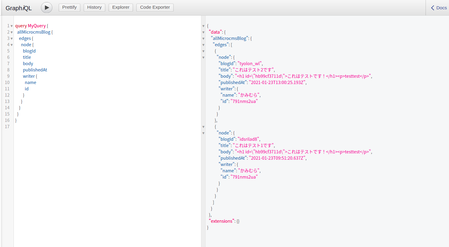 左のExplorerにある対象のクエリをクリックすると自動でクエリを展開してくれます。今回はallMicrocmsBlog > edges > nodeをクリックして、その中にあるデータを選択してみましょう。下記は一例です。真ん中上にある再生ボタンを押して、コンテンツの一覧が取得できるか確認してください。