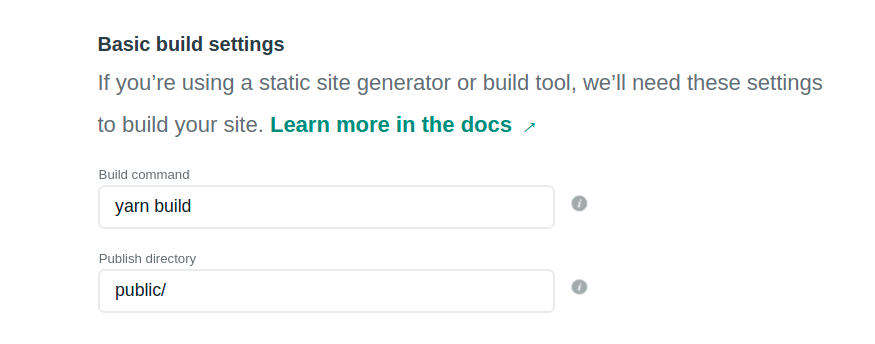 ビルド設定ができます。GatsbyJSの場合、Build Commandをyarn build、Public Directoryをpublic/にします。