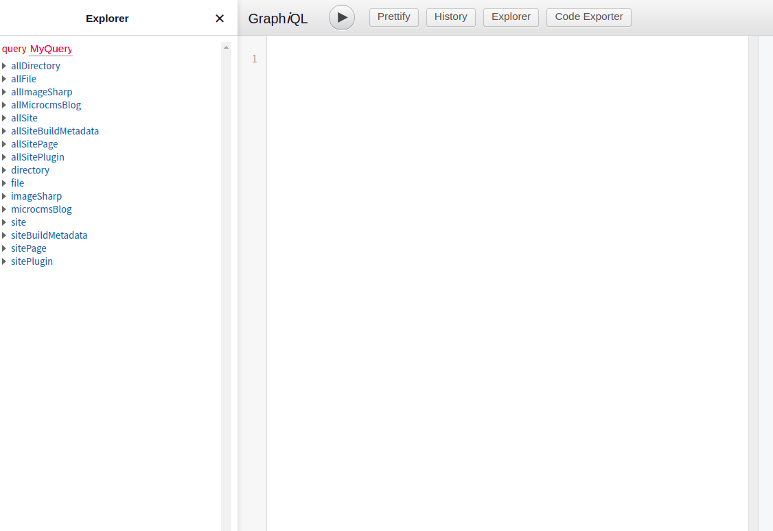 GatsbyJSでデータを取得するためにGraphQLを使います。GraphQLに慣れていない場合は分かりづらいかもしれません。なので、ブラウザ上でクエリを実行できるGraphiQLを使ってデータが上手く取得できてるか確認します。GatsbyJSの開発サーバーを立ち上げて、http://localhost:8000/_graphqlにアクセスしてください。