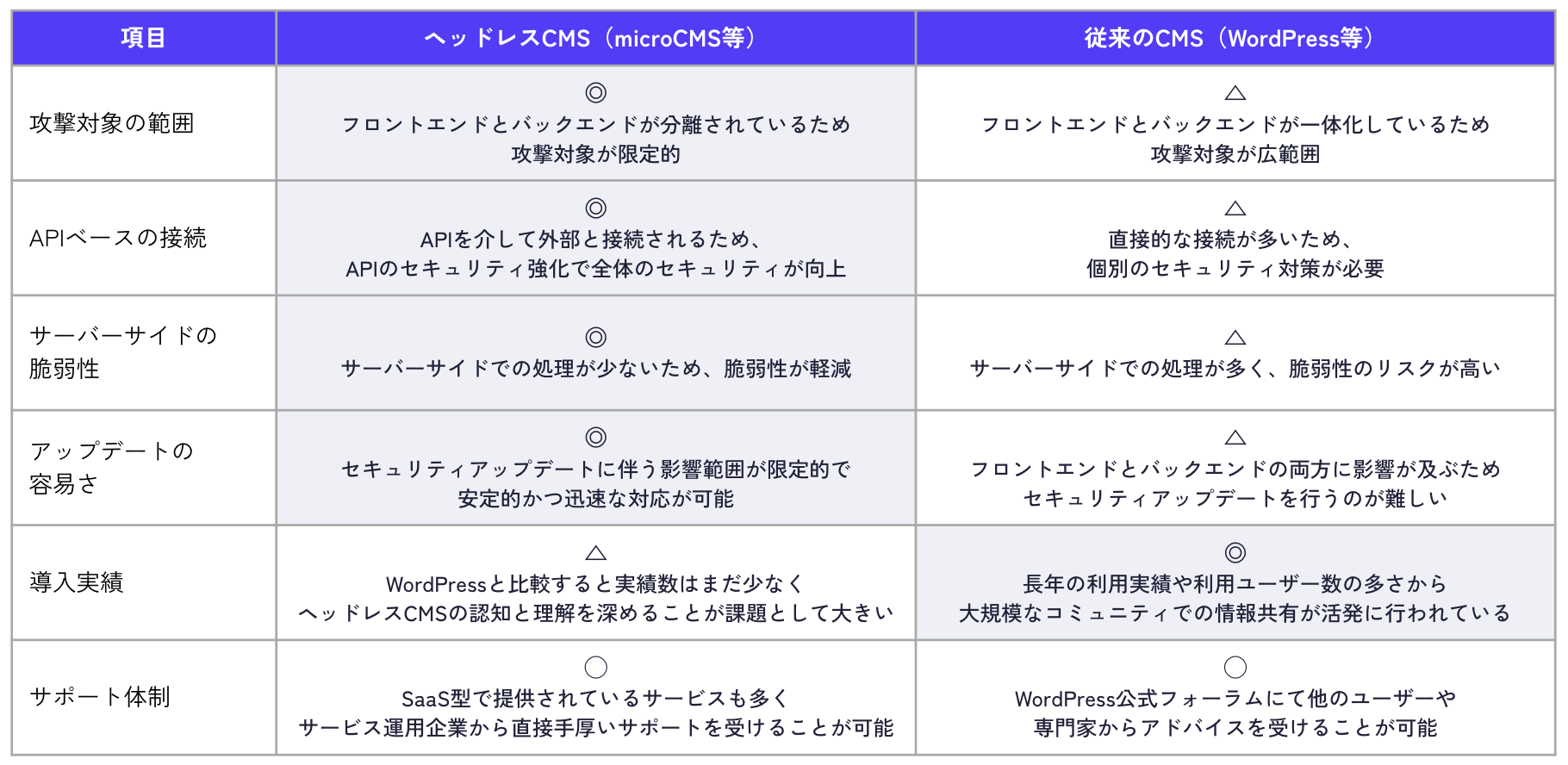 ヘッドレスCMSとWordPressのセキュリティ面での特徴や違いを以下の表でまとめています。