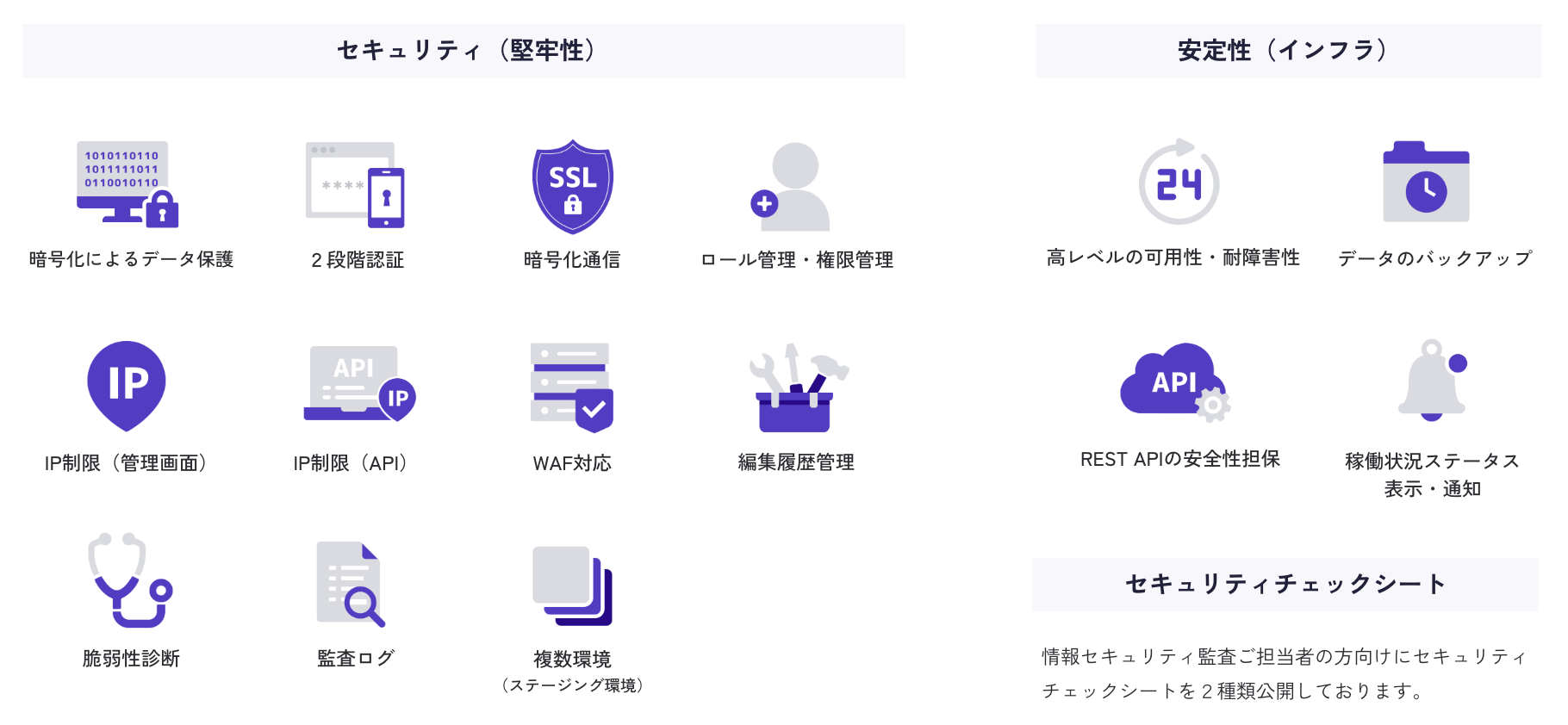 2段階認証、IP制限(管理画面・API)、権限管理、監査ログ、WAF対応など多くのサイトのセキュリティニーズに応えることが可能です。