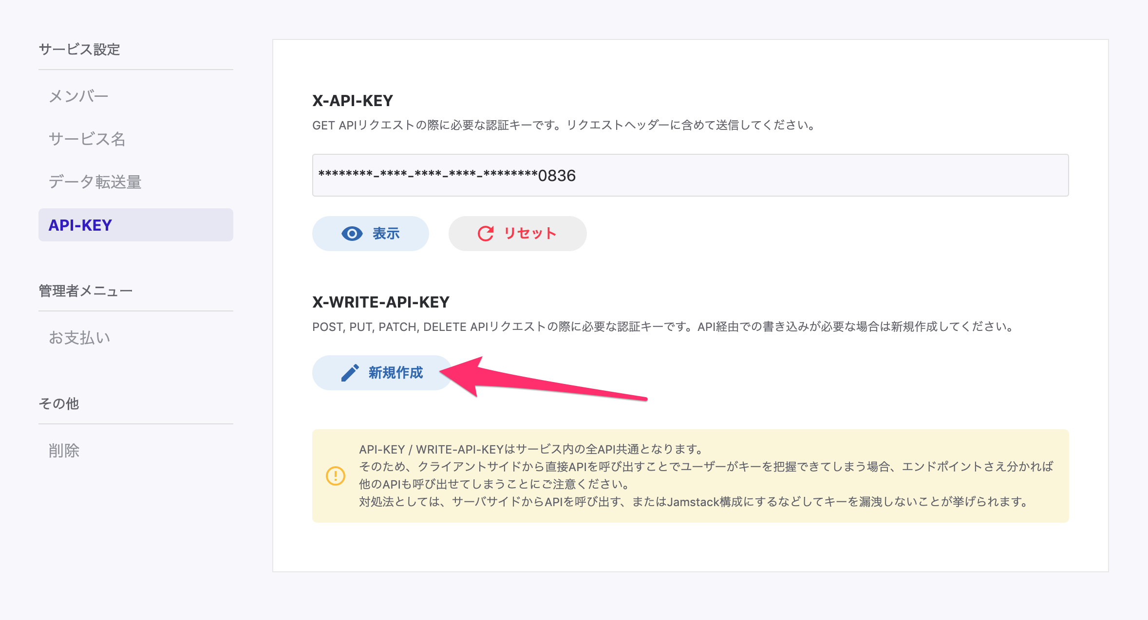 作成は管理画面内のサービス設定>API-KEYより行います。