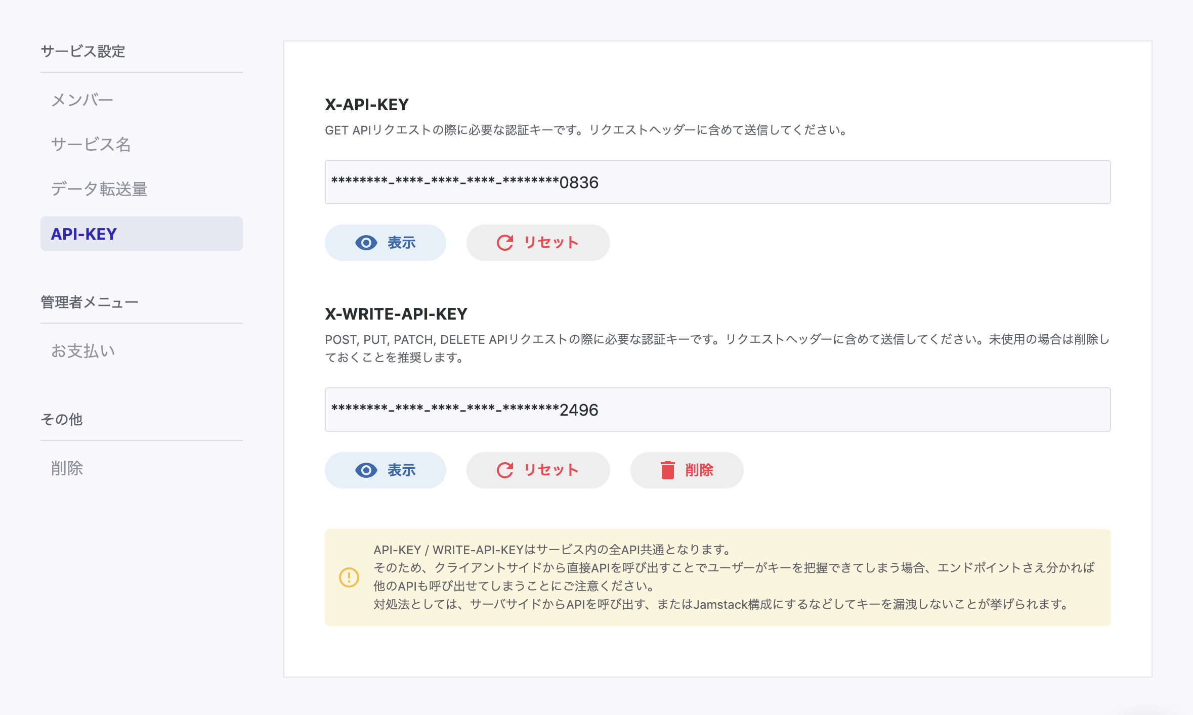 なお、X-API-KEYならびにX-WRITE-API-KEYはサービス内の全てのAPIで共通です。