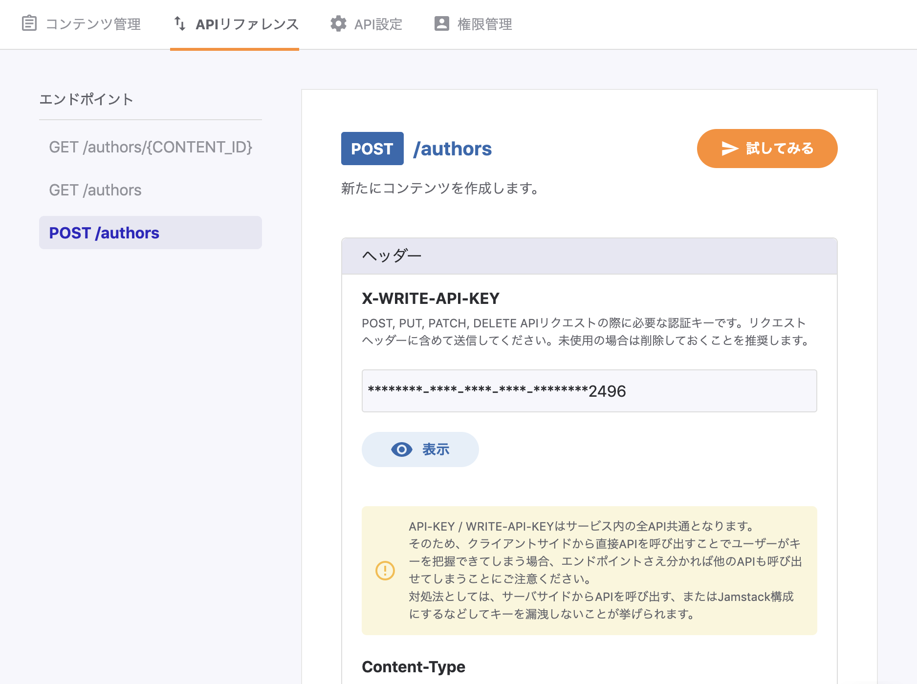 これまでのGET APIではX-API-KEYというAPIキーを使用していましたが、POST API(や今後追加予定のWrite系API)ではX-WRITE-API-KEYという値が必要です。