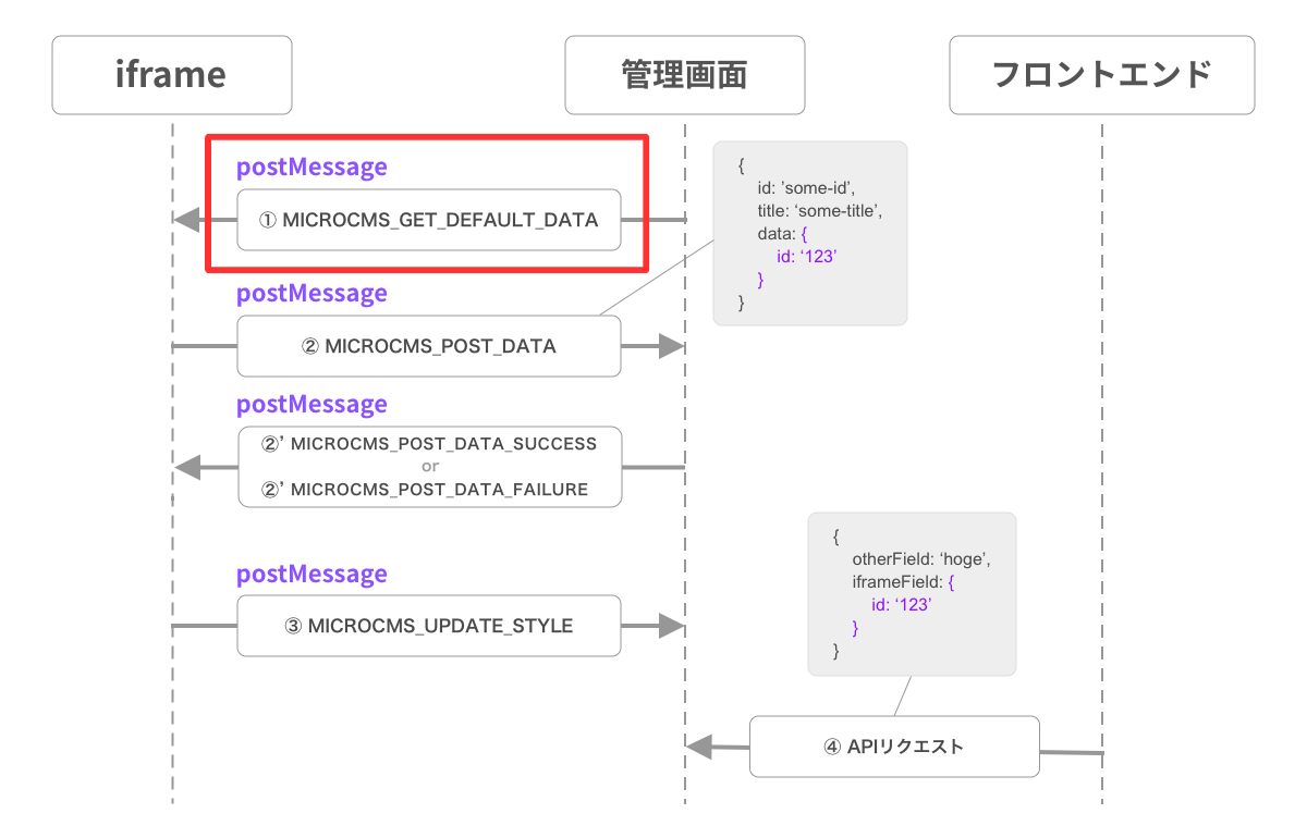上記のシーケンス図において、①のタイミングで送信されるデータ(MICROCMS_GET_DEFAULT_DATA)が今回の変更対象となります。