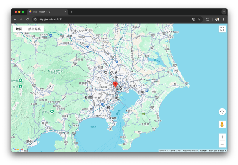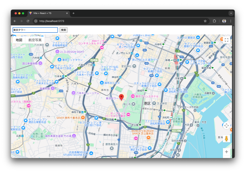 export default App;<YOUR-GOOGLE-MAPS-API-KEY> には先ほど取得したAPIキーを設定してください。