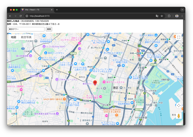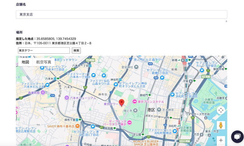 地点を選択してみます。例えば「東京タワー」で検索して、位置情報を取得しました。