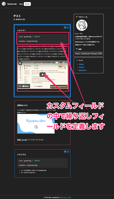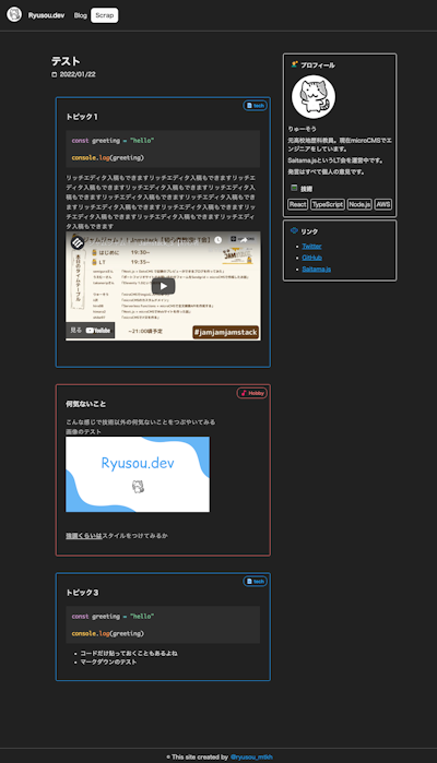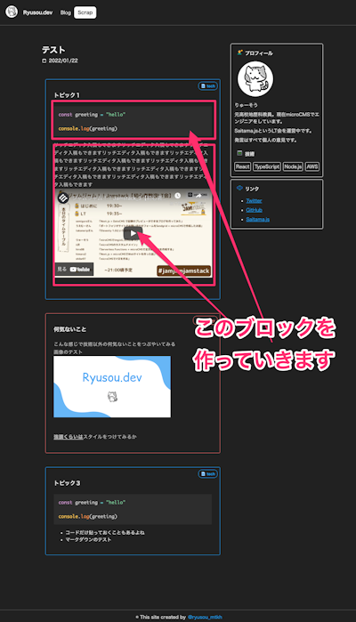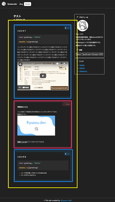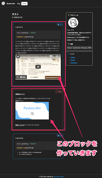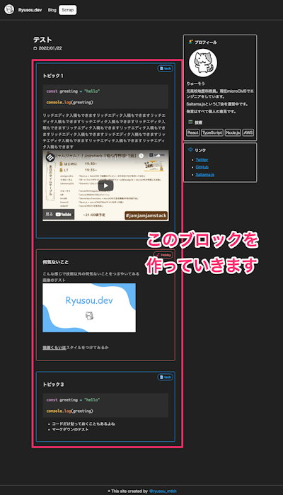 題材としてそれぞれのトピックごとにブロックで分かれつつも連続した記事を投稿する仕組みを作成してみます。