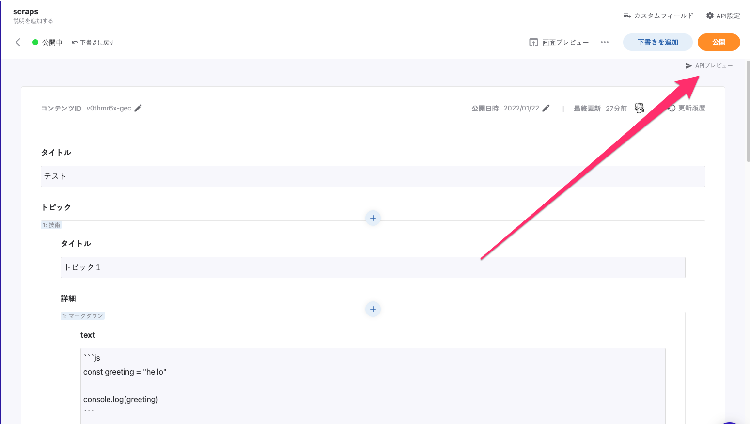 コンテンツを作成したらAPIプレビューを試してみましょう。コンテンツ編集画面右上の「APIプレビュー」のメニューより試すことができます。