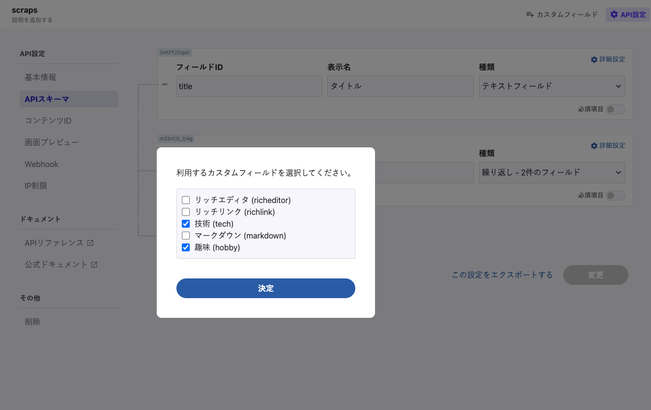 管理画面の最後にコンテンツAPIのスキーマに今回作成したカスタムフィールドを登録します。