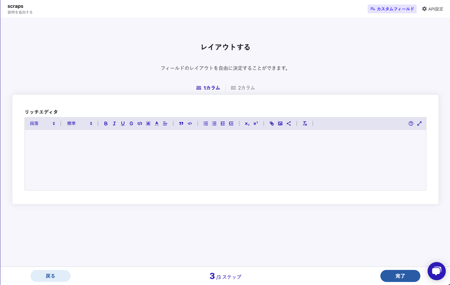 最後にレイアウトを設定します。今回のフィールドは一つだけですが、複数ある場合は2カラムのレイアウトを組んで管理画面で編集しやすくすることも可能です。