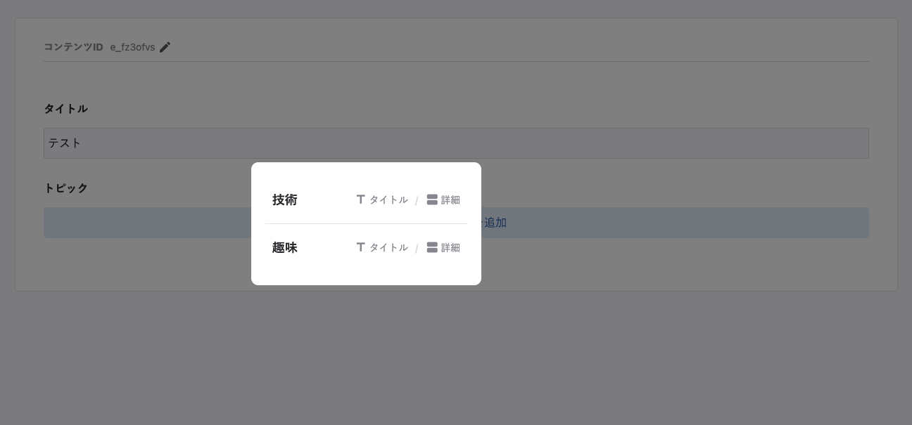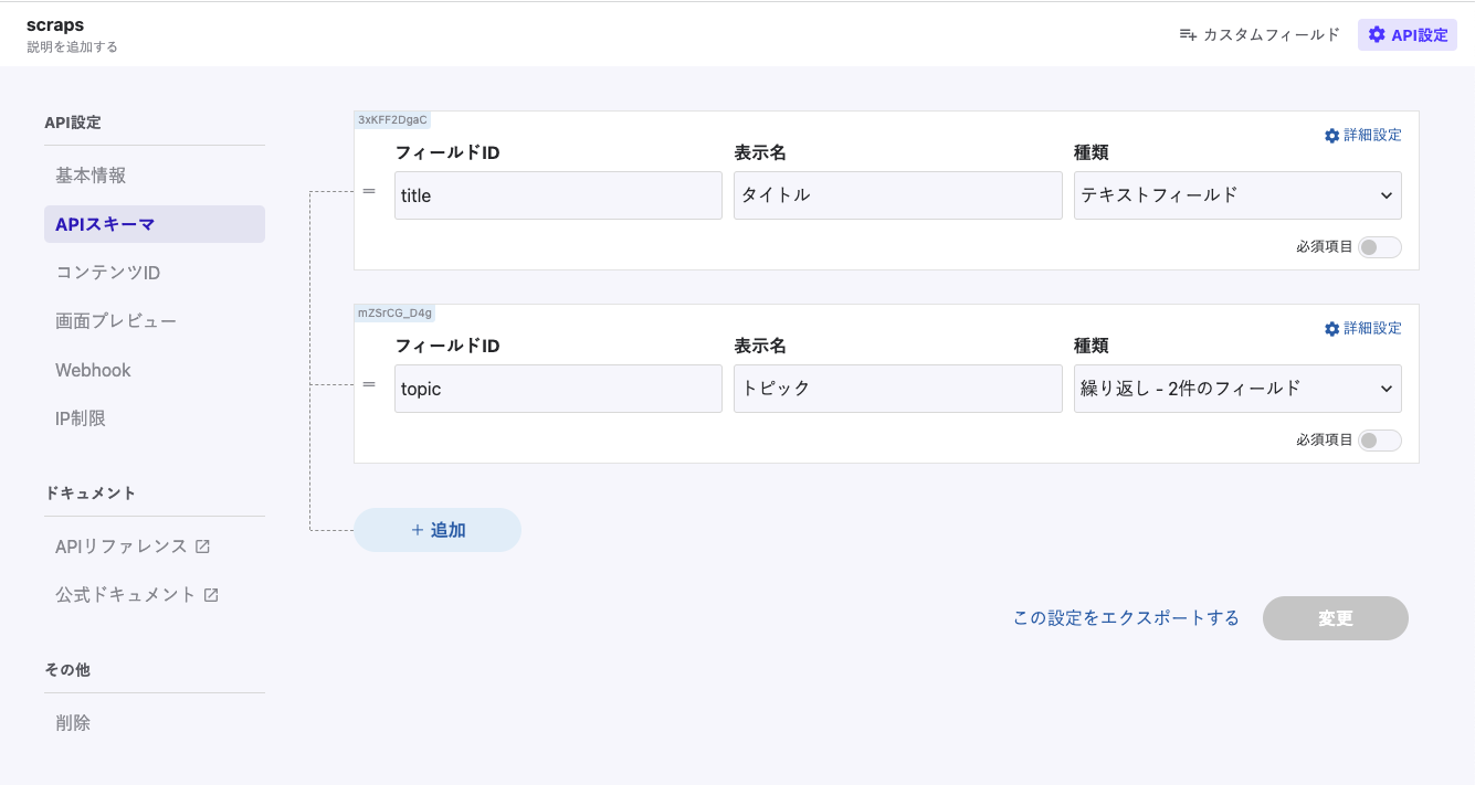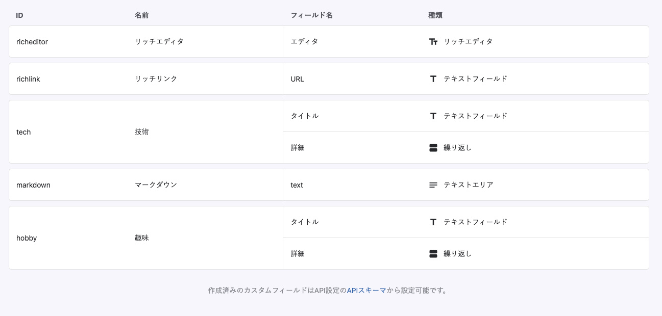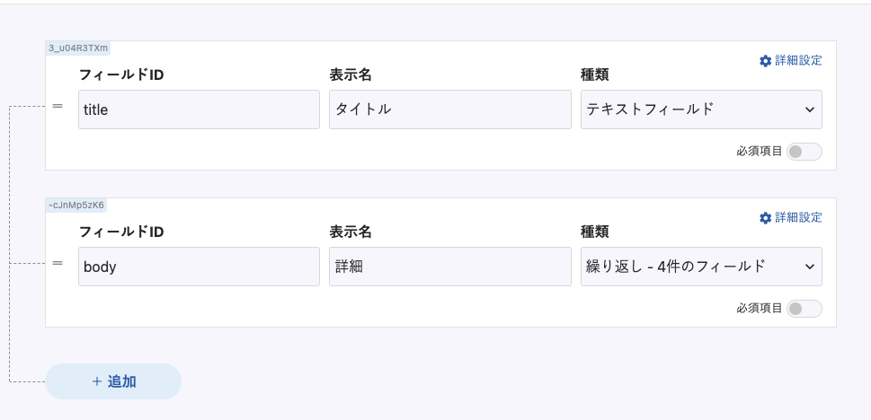 やや複雑そうに見えますが、microCMSではわかりやすいUIでこれらのフィールドを定義することができます。