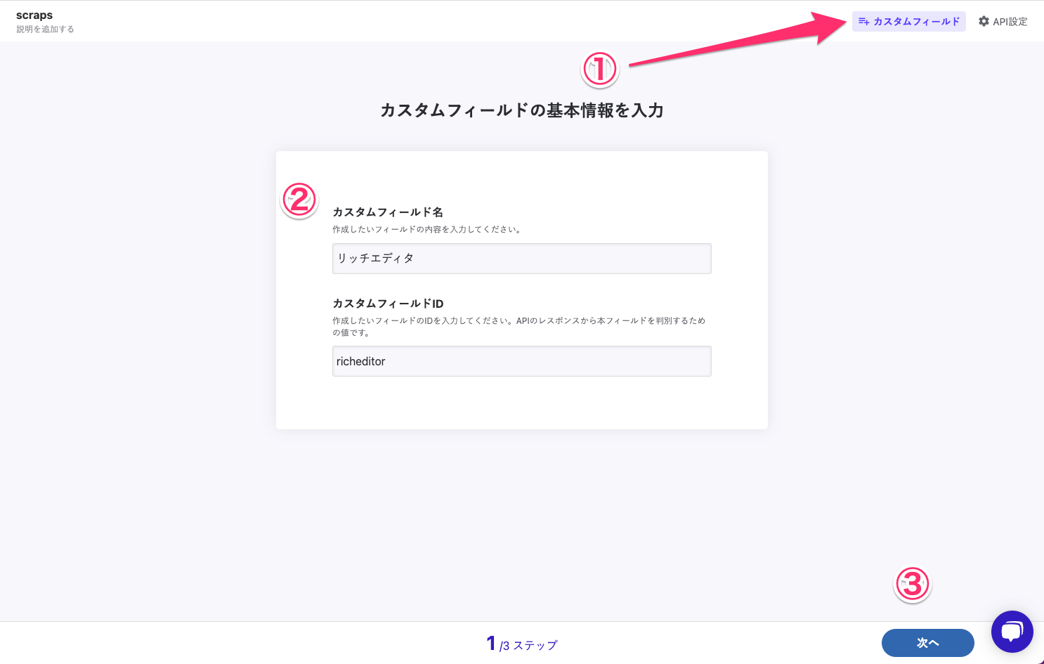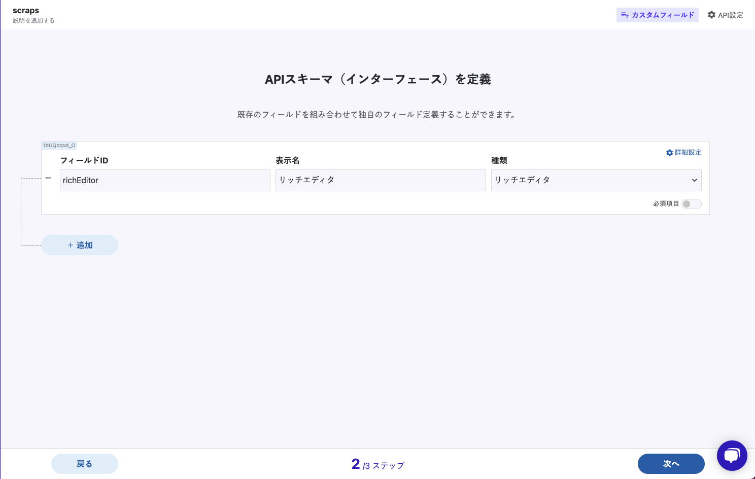 ②カスタムフールどの基本情報を入力します。ここではシンプルにリッチエディタのみを追加するので、