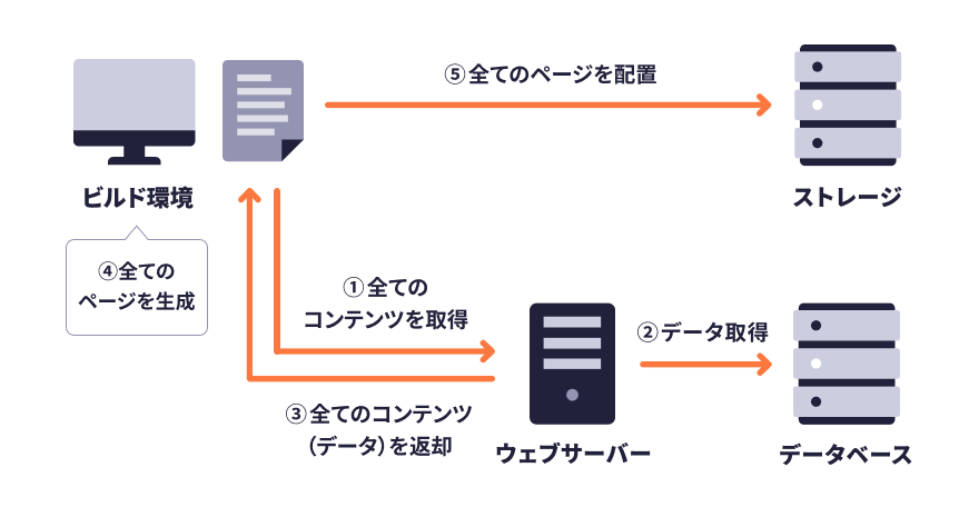 - ビルド環境がウェブサーバーより全てのコンテンツ(データ)を取得する(①〜③)
