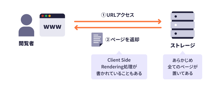 こちらのページ返却ではサーバーによる処理は一切実行されておらず、既にファイル置き場であるストレージに置いてあるHTMLファイルなどを取得するだけです。