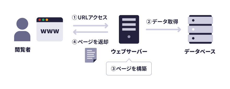 - ブラウザからリクエストを受け取ったウェブサーバーはデータを取得しつつページを構築する(②〜③)