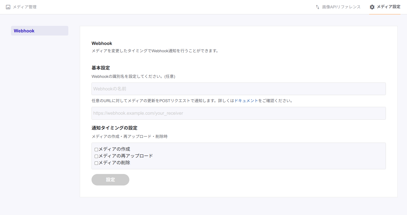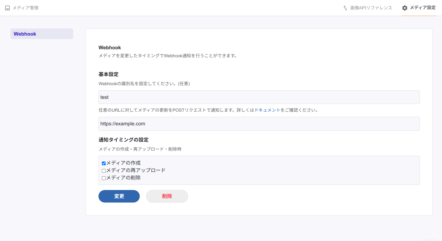 Webhookはメディアの設定から行うことできます。Webhookの識別名、通知したい任意のURL、通知タイミングが設定できます。