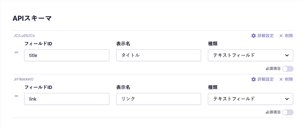 取得するmicroCMSのAPIスキーマは以下のようなシンプルなものとなっています。