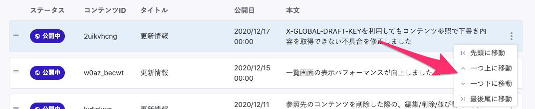 本日よりコンテンツの一覧画面のメニューに「一つ上に移動」「一つ下に移動」というメニューが登場しました。
