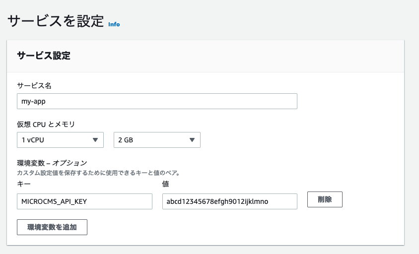 MICROCMSAPIKEYを追加。値は microCMS の API キー一覧画面から取得した値を設定。 - その他の設定はデフォルトのままでどんどん次へ
