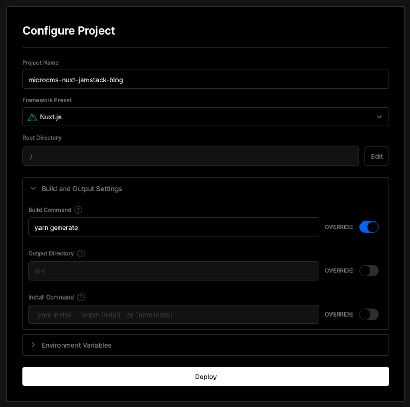 ビルド設定ではフレームワークとしてNuxt.jsを選択し、ビルドコマンドを yarn generate に設定し環境変数のセットを行います。(.envの内容)