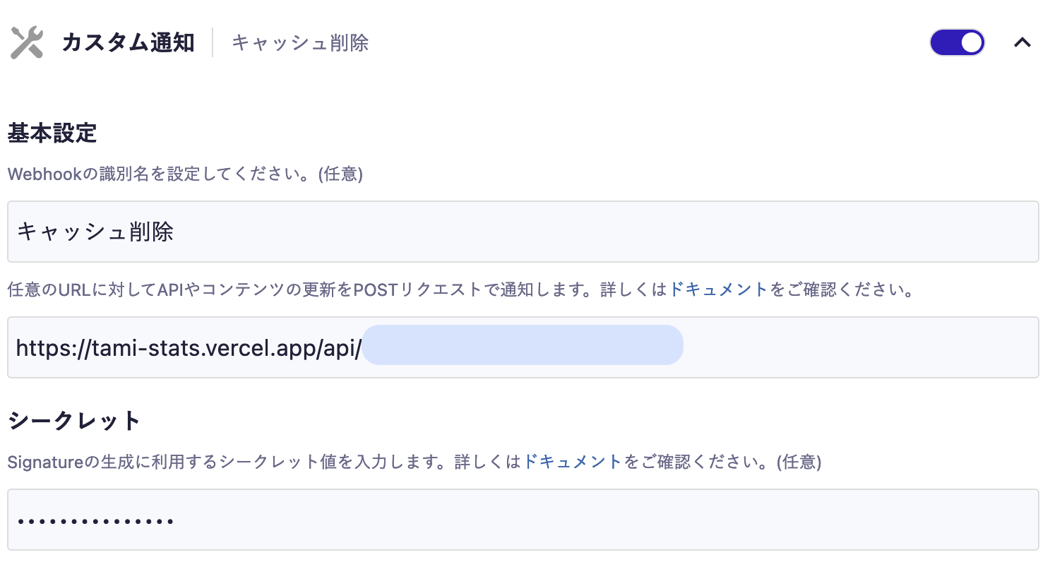 また「カスタム通知」という設定を使うことで、任意のURLに対してPOSTリクエストを実行できます。