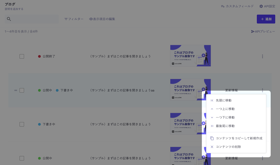 microCMSの管理画面では、ドラッグ&ドロップなどの操作でコンテンツを並び替えられます。