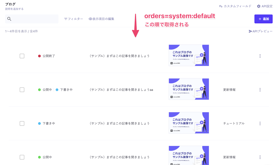 ここで並び替えた順序はAPIでのコンテンツ取得時にも利用されます。orders パラメータを指定しない場合は、管理画面と同じ並び順で取得されるようになっています。