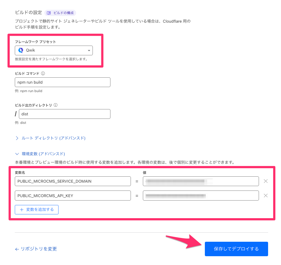 ビルド設定ではフレームワークとしてQwikを選択し、環境変数のセットを行います。(.env.localの内容)